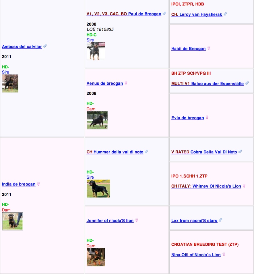 Conny is out of the handsome Multi V-1, Multi CC.J-BOB, Jr. CH., Amboss del Calvijar, DOB: 8/12/11, LOE 2047620, BH, HD+/-, ED- and her dam is the beautiful India De Breogan, DOB: 5/17/11, LOE 2035244, 62 cm./47 kg., HD-B, ED-0.